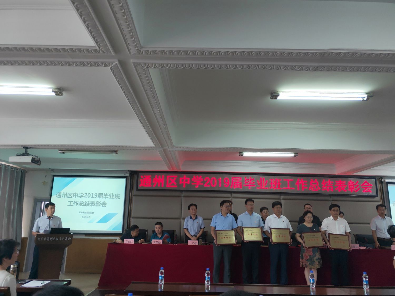 2019年9月4日,通州区教育委员会召开2019届初、高三毕业班工作表彰会,我校高中获得优秀学校称号;毛燕宁主任获得优秀管理干部称号
