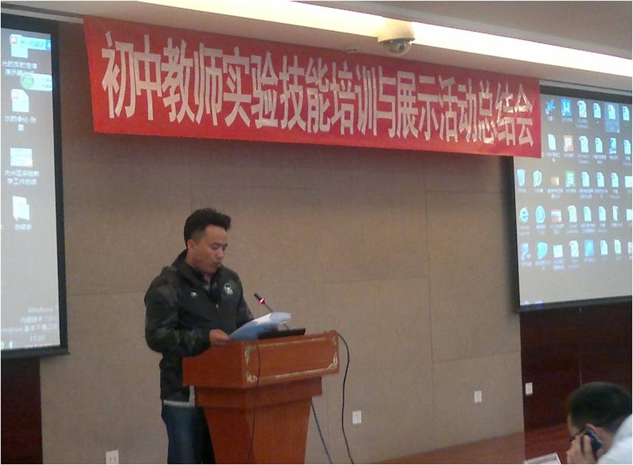 我校物理实验室实验员刘玉才教师,在北京市教委和北京市装备中心联合举办的“初中教师实验技能培训和展示活动”中,荣获实验员组一等奖,并在2014年4月17日举办的总结表彰大会上,代表全市中学实验员做《参加实验技能培训与展示和如何做一名合格实验员的心得体会》的发言。
