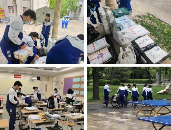天公不作美,一大早下起了小雨。班主任老师和留宿学生把同学们的学习用品或用绳子捆好,或装进塑料袋中,还细心地用便签纸贴上名字。他们化身“最美搬运工”,穿梭在楼道和甬路之间,一趟趟往返,只为同学们能尽快拿到学习物品。看着校门外一个个充满感激的眼神,再看校门内一双双有力的手,温暖而坚定的力量在一本本书之间传递,一切都是值得的!
