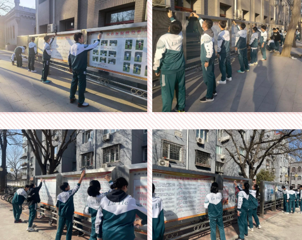 高二年级同学利用课余时间擦拭甬路橱窗,维护校园公共环境,助力文明校园。