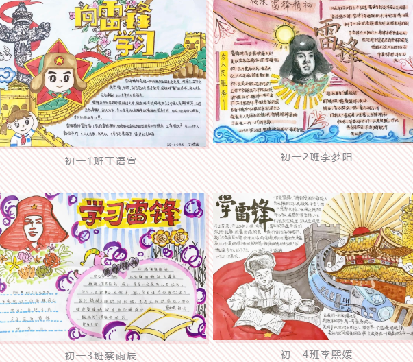 初一年级同学绘制手抄报,宣传雷锋事迹,弘扬雷锋精神。