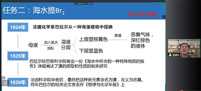 我校高中化学教研组王丽晶老师这节课是“自然资源的开发利用”单元教学的第二课时《海水资源的开发利用》,利用线上网络课,结合线上和线下,打通课前、课中和课后,以学生的活动为主,利用已有的知识解决真实情境中的实际问题,在活动中学生不但体验了学科知识和方法的应用,而且也有对科学家的科研精神和民族自豪感、国家责任感的情感体验与价值引领。在海水提镁和提溴的流程设计过程中,学生根据个人已有的知识和经验不断的自主建构从工业原料到产品的思路和方法模型,并应用模型实践海带提碘。整个过程是从具体问题的解决到概括提炼解决这类问题的模型,再应用模型完成具体任务,体验了深度学习的迁移创造的过程。