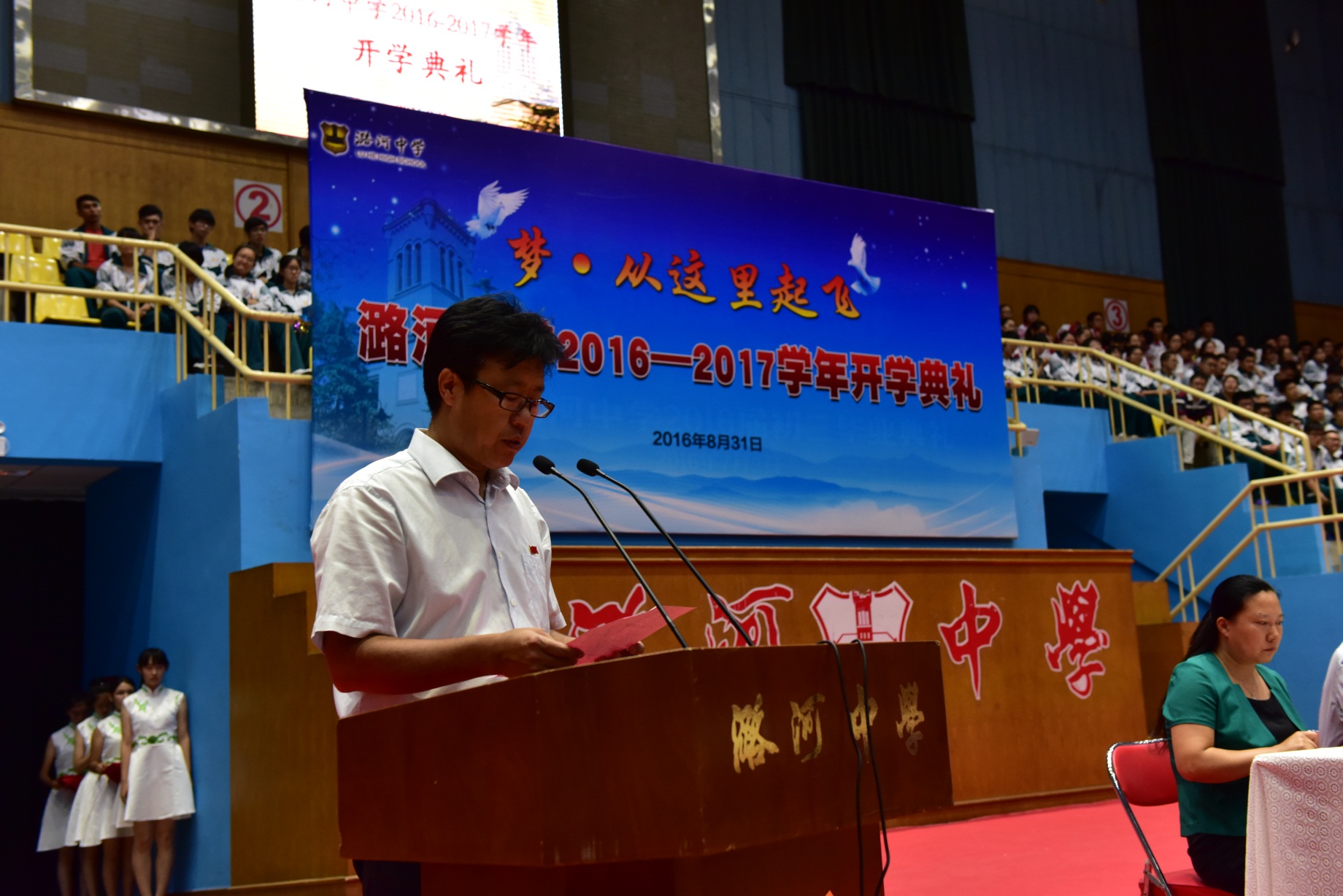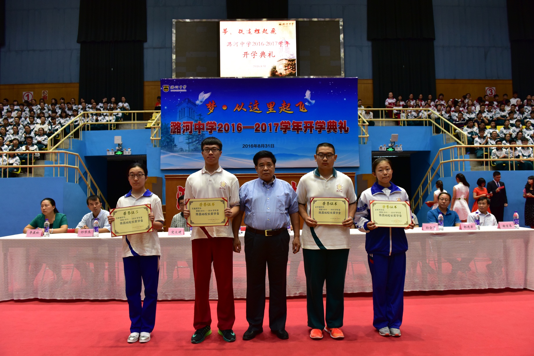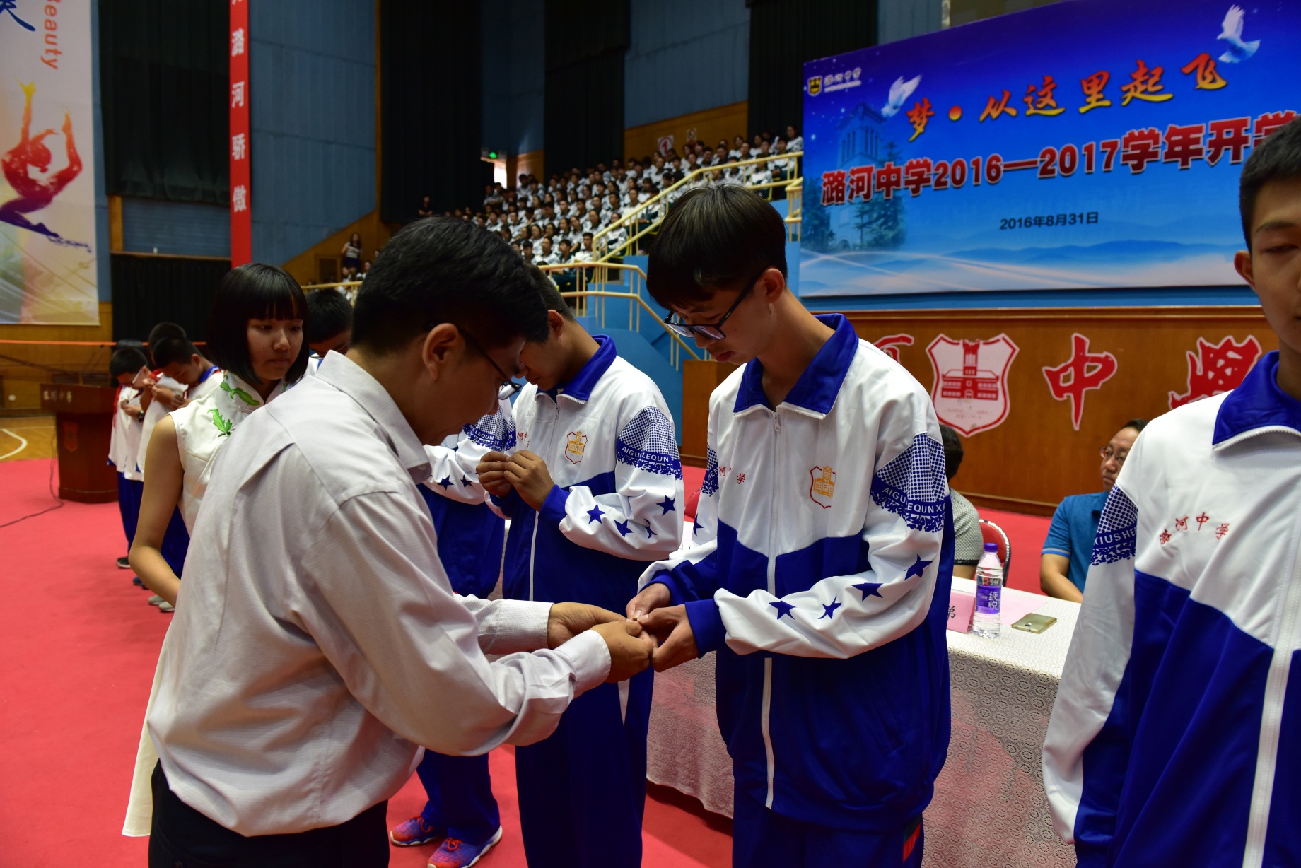 “开学第三课”是8月31日隆重的开学典礼。潞河中学原校长、潞河中学校友理事会名誉会长张世义校长, 潞河中学1969届校友、北京外交学院教授党大建先生,潞河中学校友会副会长、1962届校友、原通州区关心下一代协会会长罗敬义,韩美林艺术基金会办公室主任常静女士出席典礼,与我校师生一同迎接新学年的到来。典礼在绵长的红楼钟声中拉开帷幕。徐华校长和班主任一起为新生颁发、佩戴校徽。红蓝相间的校徽见证着潞河149年的风雨,承载着历代精英的智慧。从这一刻开始,同学们成为了一个光荣的潞河人。之后,党总支孟洪峰副书记宣布了我校获得2015——2016学年奖学金学生名单。张世义校长、党大建先生、罗敬义会长、常静女士分别为获得“陈昌祐校长奖学金”、“周文彬烈士奖学金”、“赵紫宸优困生奖学金”和“韩美林艺术奖学金”的学生颁奖。随后,刚刚被北大录取的房聪同学为学弟学妹们做主题为《坚持梦想,成就最好的自己》的精彩演讲。典礼过程中穿插播放《梦,从这里起飞》短片和来自老师、家长以及包括10名清华、北大毕业生在内的多位2016届高三毕业生给学弟学妹们录制的新学年寄语视频。之后,全体学生在学生会主席王鑫源同学的带领下,庄严承诺:在新的学年里秉承“一切为了祖国”的校训,发扬“爱国、乐群、自律、修身”的校风,主动发展,追求卓越,做具有健全人格的潞河人。最后,同学们认真的聆听徐华校长的新学年讲话,他告诉同学们“潞河中学是学生精神成长的沃土,个性发展的舞台,历经百年风云却神采奕奕,年轻稚嫩的思想在这里得到涵养和化育,飞扬灵动的青春在这里得到焕发和张扬,豁达健全的人格在这里得到铸练和成长,一切为了祖国的信念在这里生根并入生命的远方。这里并非只有聆听恩师教导的耳朵,更有寻找自己生命方向的头脑,这里并非只传达继承的观念和知识,更有成长的体验和创新的火种。”他还激励学生积累实力,发掘潜能,成为拥有健全人格的潞河人,拥有无悔人生的卓越的自己!最后,开学典礼在激昂的校歌声中圆满结束。
