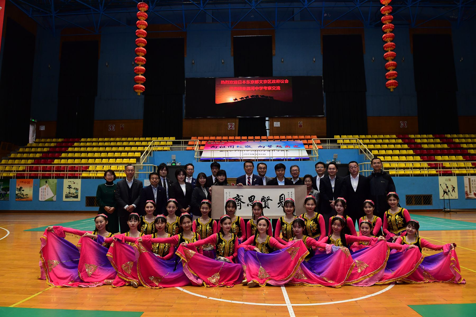 在徐华校长的带领下,日本友人首先来到了潞友体育馆。潞河中学雪莲舞蹈团用精彩的新疆舞蹈来迎接客人们的到来。随后,在徐华校长的欢迎辞中,徐校长对客人们的到访表示热烈的欢迎,并回顾了潞河中学近年来同日本交往的历史,期盼中日两国不断深化教育合作。日方代表对潞河中学的热情接待表示感谢,并希望中日青少年能够加强相互交流,促进彼此了解。最后,双方互赠礼品并合影留念。