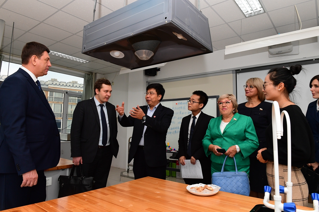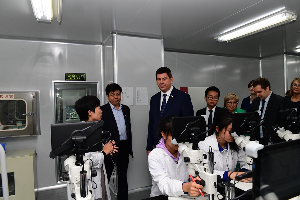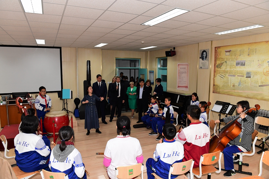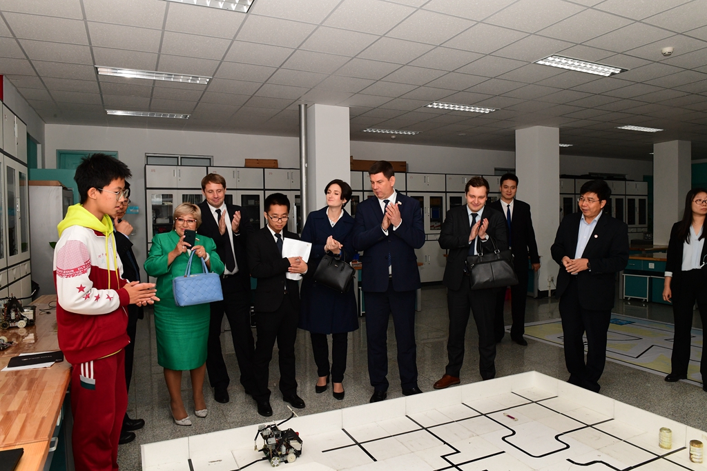 在徐校长的引领下,俄罗斯代表团首先来到我校生物无菌实验室,与实验室的师生们亲切交流;在CYPT社团教室,CYPT社团师生们用俄语欢迎远道而来的朋友们,并向俄罗斯代表团成员们展示在刚刚过去的国庆假期前往俄罗斯天然气学校友好校参加国际科学实践大会的成果;随后,俄罗斯代表团走进我校纸艺教室和烹饪教室,并品尝新鲜出炉的玛格丽特可口饼干;在机器人社团教室,我校师生向俄罗斯朋友们介绍机器人社团研究课题,并就一些专业问题与俄罗斯朋友交换意见。随后,俄罗斯代表团来到我校摄影教室,与摄影社同学们亲切互动,合影留念。俄罗斯代表团还参观了我校书法教室、剪纸教室;在民乐教室,俄罗斯朋友们欣赏我校民乐团演奏的自己创作的曲目《源》,并与民乐团成员就感兴趣的话题互动交流。最后,俄罗斯朋友们走进潞河国际教育学园,了解国际课程的开发与建设。