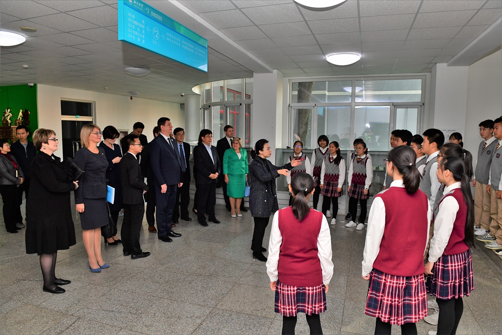 俄罗斯客人走进黄昆楼,潞河中学初中部韵之灵合唱团用两首天籁之音迎接客人的到来。随后,在徐华校长的欢迎辞中,徐校长回顾了潞河中学近年来同俄罗斯交往的历史,并期盼随着中俄关系的持续升温,两国不断深化教育合作,使更多的中学生受益。斯米尔诺夫副主席表达对潞河中学的感谢,并表示希望中俄青少年能够加强相互交流,促进彼此了解。