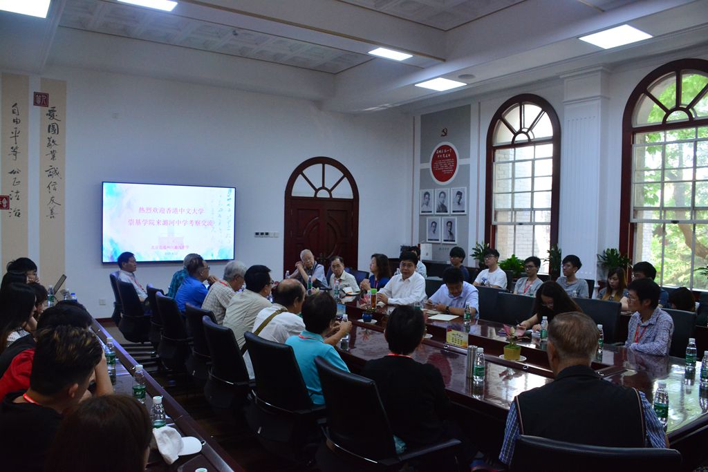 在座谈会上,徐华校长向香港客人们详细介绍了潞河中学的历史与现代,着重讲述了潞河中学校史研究的发展以及办学理念的传承。香港客人们也就感兴趣的话题与徐校长,孟书记交换意见。随后,香港客人们分为两组,分别在孟洪峰副书记和包绍洁副主任的带领下参观校园古建筑群。客人们饶有兴致的参观了解放楼、人民楼、红楼以及潞友楼。香港客人们纷纷拿出相机,在德辰山、协和湖、入德之门、校史馆等地拍照留念。崇基学院的师生们不但感慨潞河中学对校史内容的完好保存,更赞叹我校对办学理念的传承与发扬。