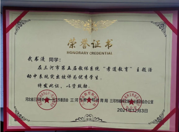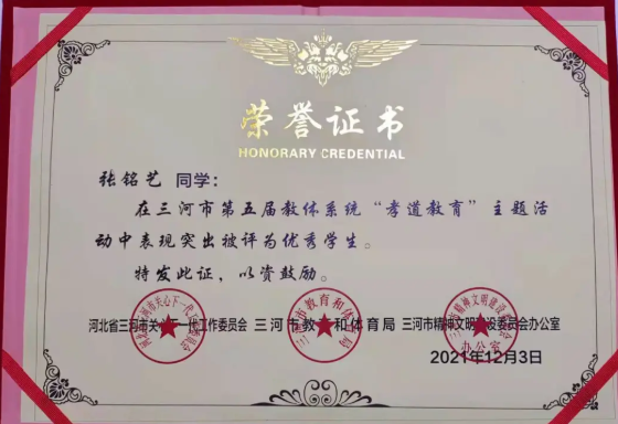 经过学校推荐、评委会评审,我校3名学生被评为“三河市第五届教体系统孝道教育活动优秀学生”。
