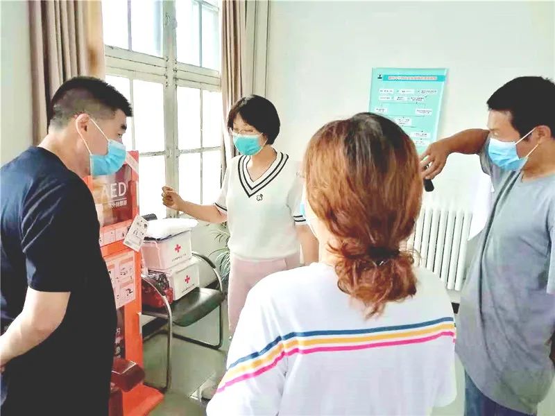 在医务室,检查组检查医疗设备设施时,对AED除颤仪摆放位置及使用规则提出建议,在与相关人员共同商讨后进行了改进。
