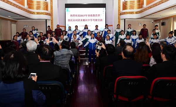 9月29日上午,由教育部组织,香港教育局副局长蔡若莲女士带队,香港数十所高中学校校长、主任组成的2017年香港教育界国庆访问团在驻港中联办、教育部港澳台办及北京市教委相关部门负责人陪同下来到潞河中学考察交流。潞河中学徐华校长、各教研室主任及特级教师及合唱团的成员们热情的接待香港客人。