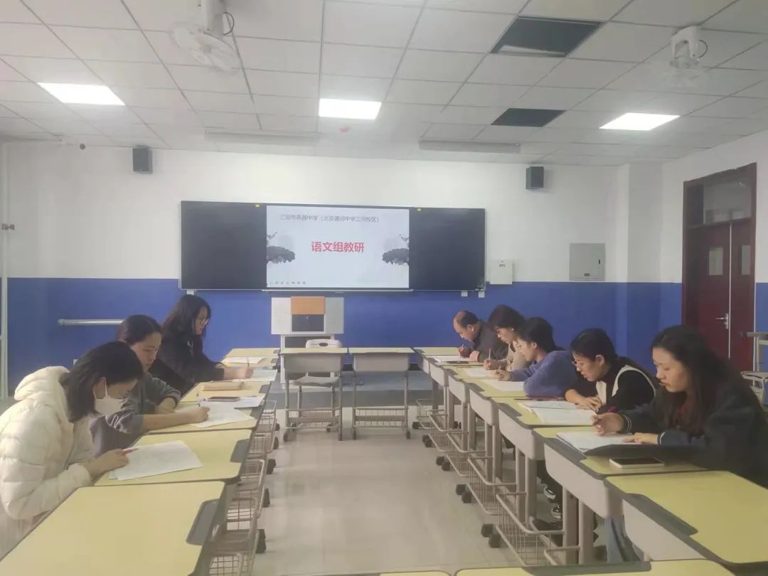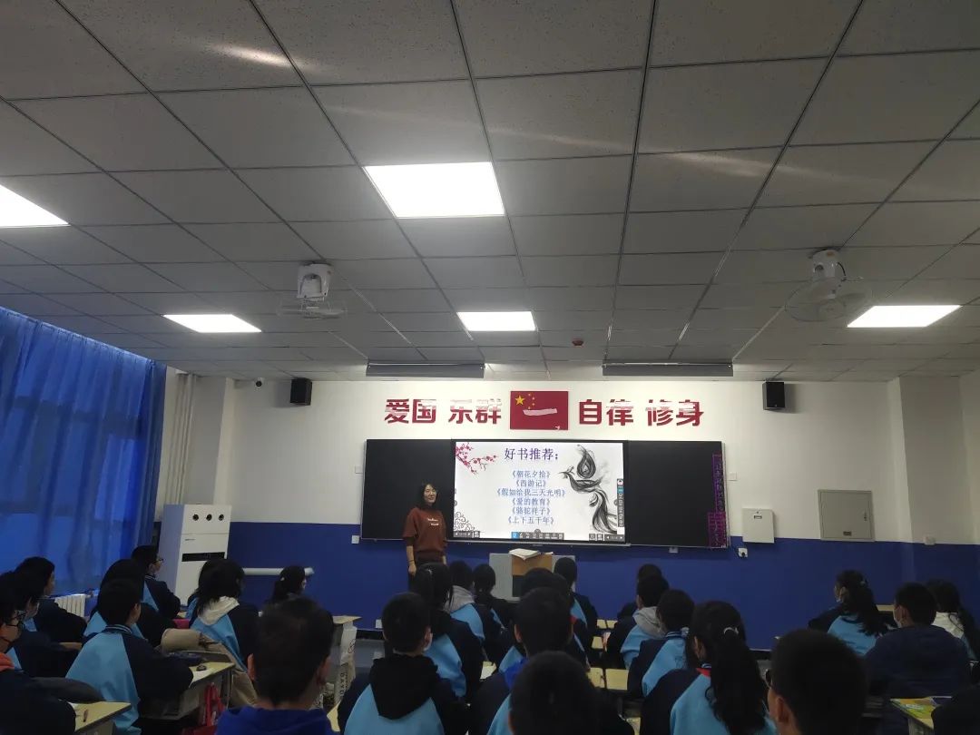 语文备课组全体教师集体教研,群策群力,教研后,教师们引导组织学生开展阅读推荐课、方法指导课、读书成果交流课,对于上课出现的问题,进行反思,及时调整。