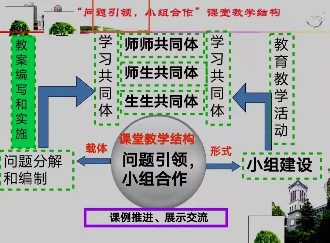 根据学校实际情况和学生的特点,学校干部团队提出了“问题引领,小组合作”的课堂教学结构,并成立领导小组,通过培训、实践、总结、再培训,再实践,再总结的循环上升通道,取得了初步的成果,在此过程中,打造出多个层面的学习共同体。