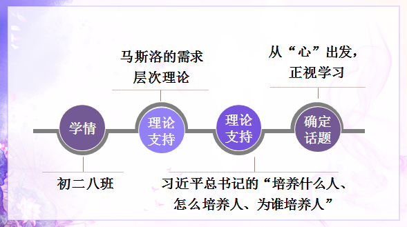 侯老师针对班级学生学习动力不足、学习积极性不高的现状,用“人为什么要学习”这个问题,对全班学生及家长进行了前测,并依据对前测结果的分析,结合马斯洛的“需求层次”理论和习近平总书记有关“培养社会主义建设者和接班人”的论述,确定了“从心出发,正视学习”的班会主题,确立了鲜明的教育目标。