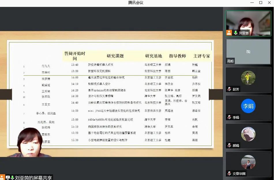 清华大学的罗先武教授、张文增教授、李辉高级工程师、高炬教授,北京理工大学的郝娟教授、齐志权教授、杨林教授、杜巍副教授,韩立金副教授,北京科技大学的陈章华教授、黄瑛工程师、蒋朋副教授,北京师范大学的肖凯博士等出任本次考核的专家。北京市通州区潞河中学成长教研室主任刘亚茵主持答辩会,科研处李丽主任和物理教研室张晓、赵芳、李娟、谷伟凤老师也参加了此会议。