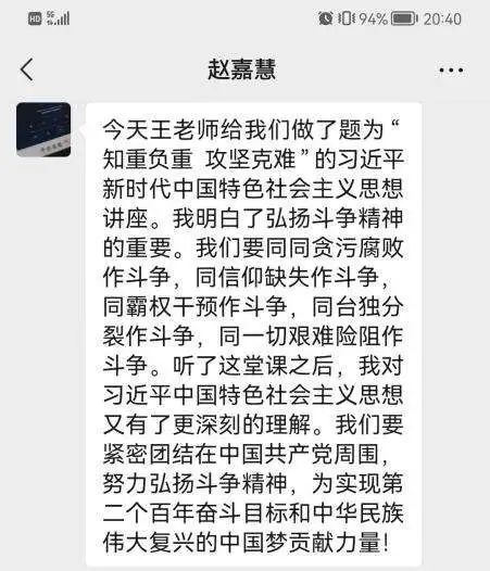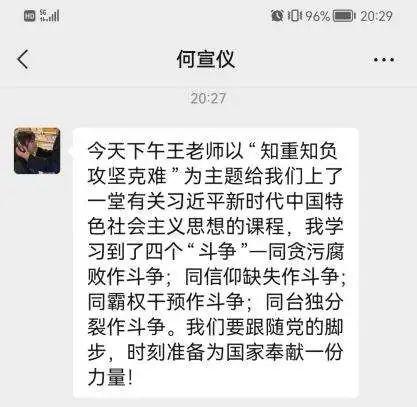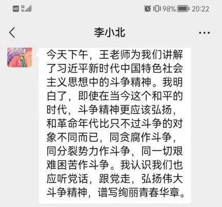 首先,王老师带领同学们一起学习了总书记建党百年讲话和十九届六中全会原文,明白了伟大斗争精神对于党和国家事业发展的重要意义。知道了斗争精神不仅是革命战争年代的必需,更是新时代中国特色社会主义建设的呼唤。同新冠疫情作斗争,同黑恶势力作斗争,同贪污腐败作斗争,同前进道路上一切艰难险阻作斗争,是我们从胜利走向胜利的必然要求。