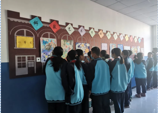 教学楼的公告栏中展出了一幅幅想象奇特、色彩斑斓的获奖科幻画,为孩子们的梦想插上了翅膀,成为校园里一道靓丽的风景线。走近作品展示长廊,呈现在眼前的不仅仅是一件件“无声胜有声”的作品,更是学生们对未来科学技术蓬勃发展的信心,同时也凝聚着学生们的美育成果。