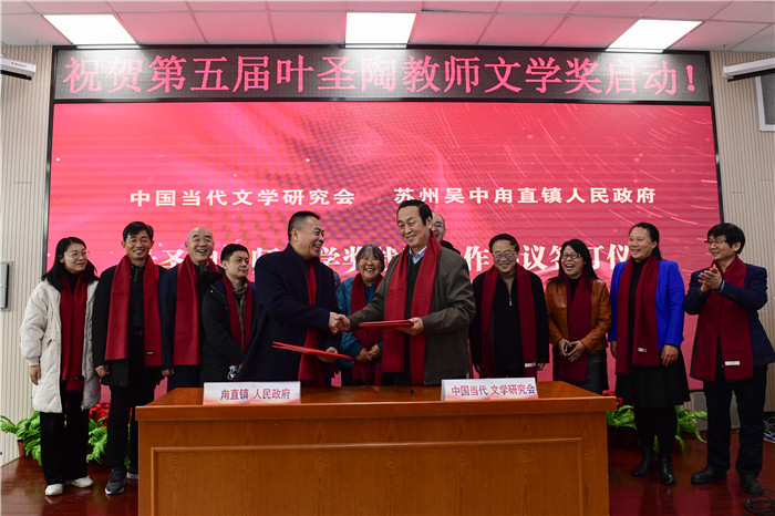 最后,中国当代文学研究会会长白烨先生与苏州市吴中区甪直镇人民政府镇长陈菊林先生签订合作协议。叶圣陶先生教育生涯开启的地方——苏州甪直镇,将作为叶圣陶教师文学奖永久的颁奖所在地,成为教师作家们心中的圣地。