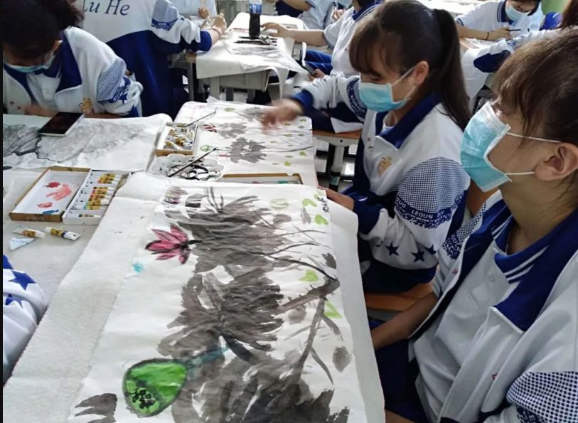 国画--课堂上同学们挥动手中的笔墨,将祖国的大好河山描绘在宣纸上。