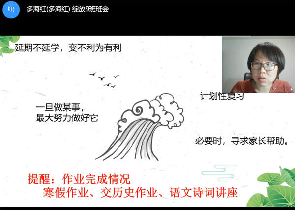 为活跃学生们创造居家学习的氛围,班主任们挖空心思举行了一次次丰富多彩的主题班会,从标题到内容,再到预期效果,都反复琢磨。