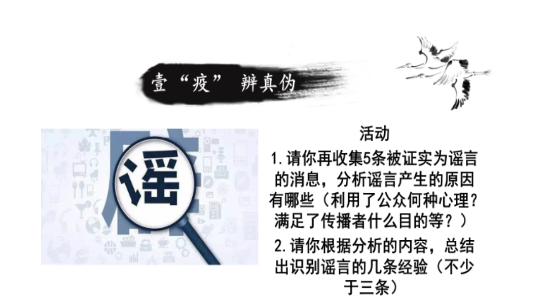 第二部分主要是针对如何分辨信息的真伪进行,旨在于引导学生学会分辨谣言,不信谣不传谣,学会思考,增强判断力,在网络中也能做一名合格的中学生。