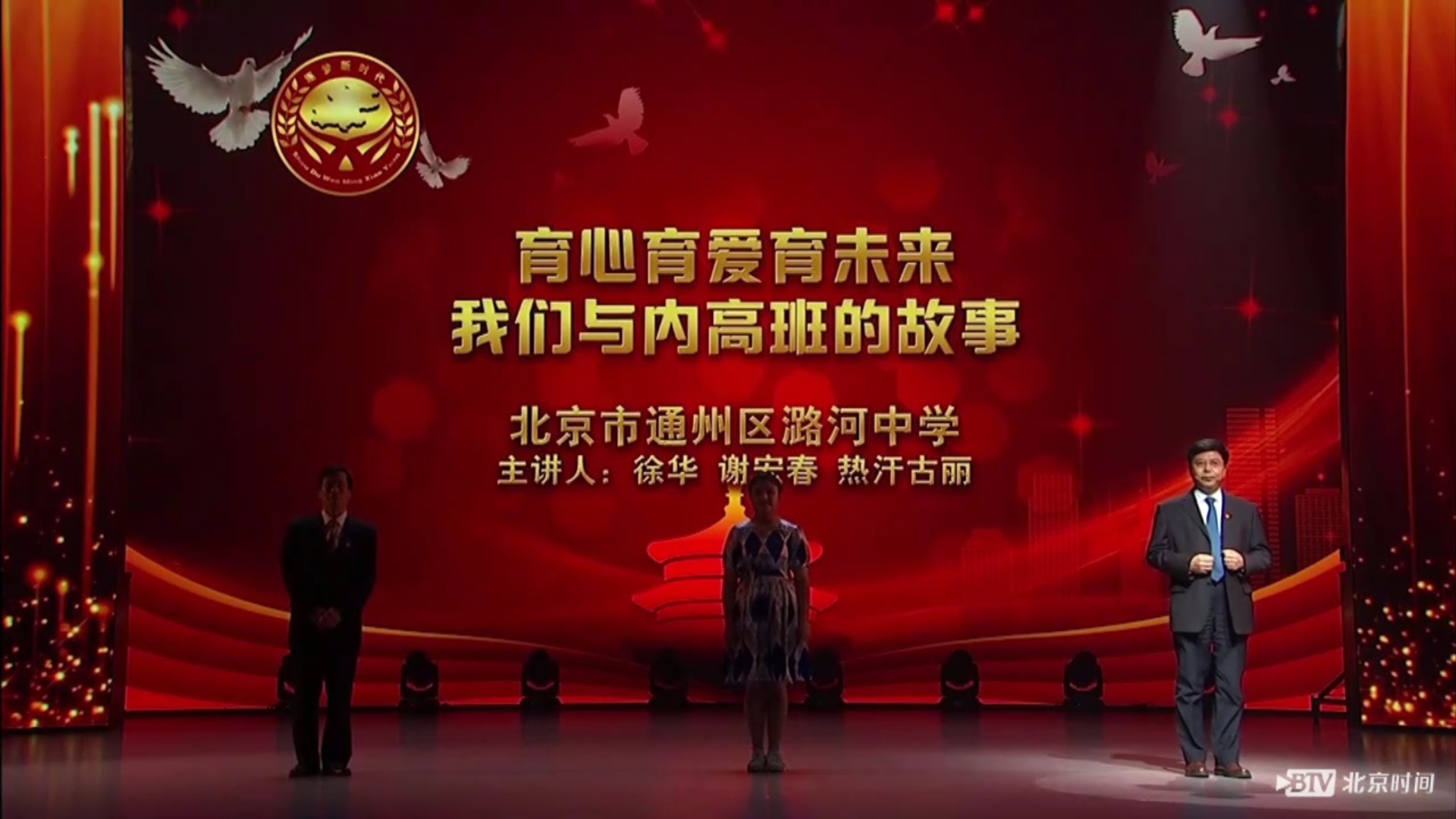 在我校分享环节中,徐华校长、谢宏春副校长和内高班学生热汗古丽共同讲述了我校师生与内高班同学之间感人的民族团结故事。谢校长以一段送别高三毕业生的视频引入,介绍了我校内高班的办班情况、教学模式和为促进民族团结所采取的措施;热汗古丽同学通过自己的回忆和感受,描述了与同学、老师交往中的一点一滴,并表达了自己作为一位高三毕业生的目标和决心,希望能考上师范类大学,毕业后扎根新疆、建设新疆;徐校长讲述了他带领干部教师利用暑期坚持新疆家访的感人故事;他表示学校会牢牢把握立德树人根本任务,持续做好内高班工作,努力培养担当民族复兴大任的时代新人。三位讲述人用质朴的语言、真挚的情感,真实生动地讲述了我校办班近20年来干部、教师、本地同学与内高班学生的一个个感人故事,在场观众无不动容;我校舞蹈队的精彩表演也赢得了现场观众的阵阵掌声。