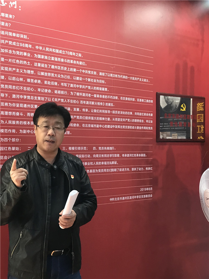 2019年10月21日中午,支部党员们齐聚位于我校校史馆一楼西侧的北京市通州区教育系统党性教育基地开展主题教育活动。中共潞河中学党总支书记徐华同志作为周文彬支部的一名普通党员也积极参与了分支活动。