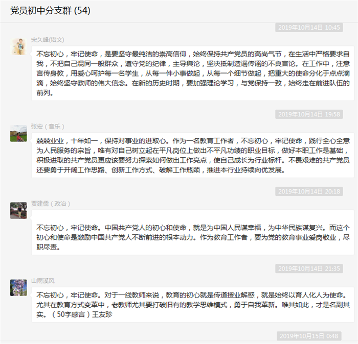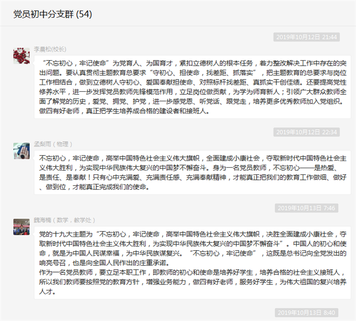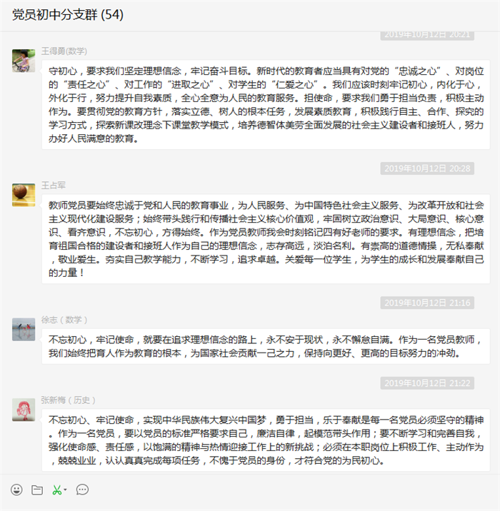 支部利用微信党群,开展了以“不忘初心、牢记使命”为主题的交流研讨活动,党员教师结合自身工作,用文字说自身,谈感悟,表决心。