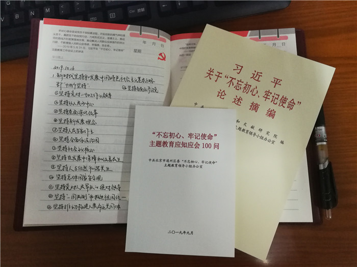 总支为每位党员同志配发了《“不忘初心、牢记使命”主题教育应知应会100问》《习近平关于“不忘初心、牢记使命”论述摘编》,党员同志们积极读书做摘抄,读原著、学原文、悟原理,领会其中精神、内化于心,并用实际行动践行自己的初心、使命。