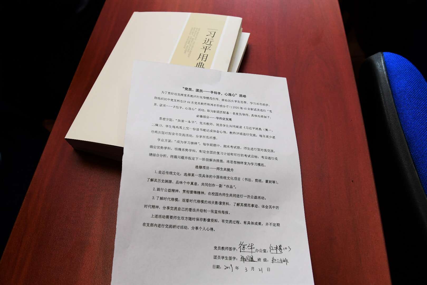 党员教师将写有寄语的《习近平用典(第一、二辑)》送给团员学生,嘱咐他们要铭记自己的团员身份,不仅做思想上的榜样,更要做学习上的模范。