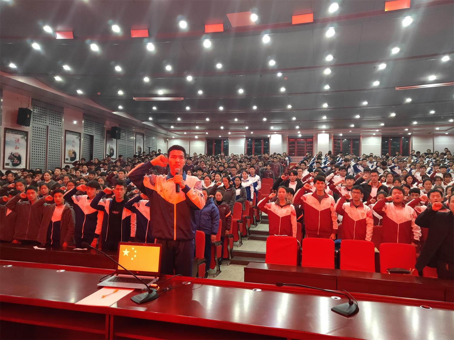 随后,举行了“发声亮剑”活动,全体学生在学生会干部阿迪力江的带领下进行庄严宣誓:“我的祖国是中华人民共和国,我是中华民族大家庭的一员,我将遵纪守法,反对民族分裂,自觉维护祖国统一和民族团结,求知问学,增长见识,丰富学识,成为德智体美劳全面发展的社会主义建设者和接班人,为实现中华民族伟大复兴的中国梦而努力奋斗。”