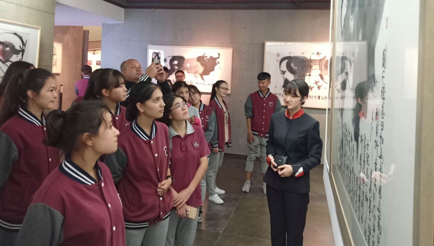 参观过程中,同学们先后浏览了序厅、陶瓷馆、综合馆、雕塑馆、书画馆、新作馆和影视厅,听取了讲解员生动详细的讲解,为一件件技艺精湛的艺术品所惊叹的同时,更为韩美林先生执着的艺术追求所折服。通过参观和学习,同学们深刻感受到了艺术作品中蕴含的浓郁深沉的家国情怀和素雅悠远的民族气韵,并为中华民族拥有如此灿烂丰富的文化感到深深的骄傲和自豪。