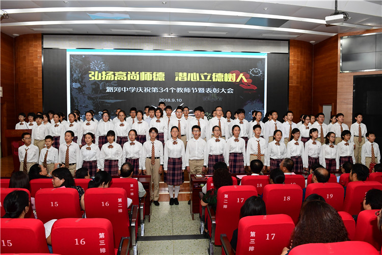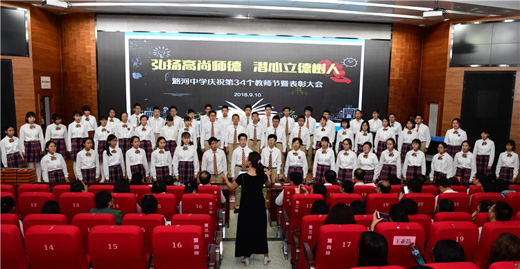 潞河中学“韵之灵”合唱团的同学们为教师节献歌,初二年级学生朗诵《献给您---亲爱的老师》。同学们通过视频向全体教师送来温馨的祝福,他们一起大声说出“老师,教师节快乐!老师,您辛苦了!”,更是将现场气氛推向高潮。