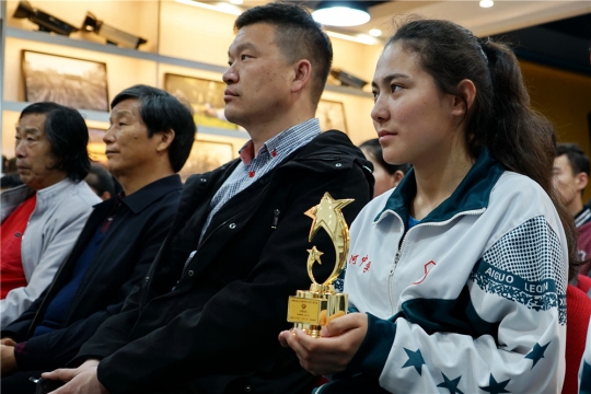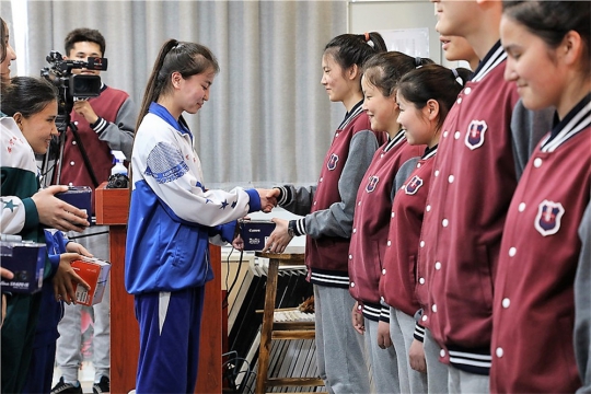 接下来,由许洪绪先生为我校高三毕业生哈拉哈提同学颁发公益之星奖杯,哈拉哈提同学在首届青少年少数民族摄影大赛中凭借一张《奶奶喝的啥》摄影作品,取得了一等奖的优异成绩,成为潞河中学内高班的骄傲。其作品在2017年北京国际摄影周期间展出。