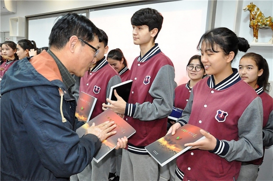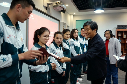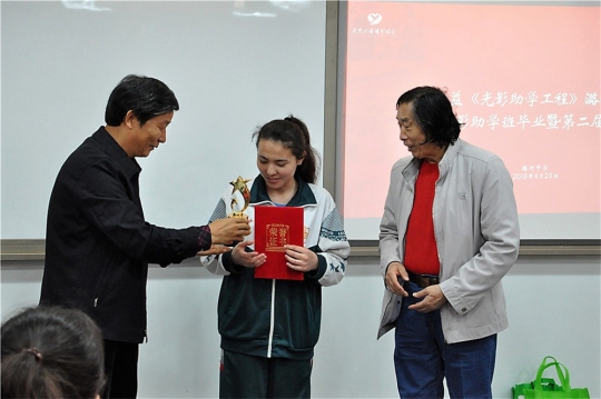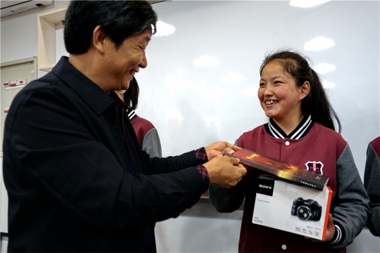 新生代表姜琰同学上台发言,她谈到了对光影助学工程理解:“光影助学工程不仅仅是一项工程,它更是我们各民族传播本民族文化,生活习俗的载体,通过记录生活中的点点滴滴,将多姿多彩的民族风情完美的呈现出来。”是的,正如她所说的那样,摄影是我们各民族沟通的一种方式。在许洪绪先生和王福春先生的先后发言中,都将光影助学工程与民族交流深深的联系在了一起。在最后一个环节中,由光影助学班即将毕业的学生为新同学传递交接相机,由许主席、姚勇老师为学生赠送摄影画册。这20位同学都表示了对北京公益摄影协会的感谢,同时还感谢了学校对他们的支持。他们一定会拿出行动,拍出有情感,正能量的作品来回报那些一直在背后默默给予他们帮助的人。