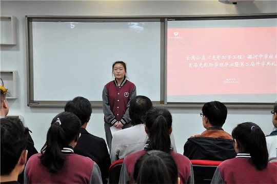 随后,高二学生苏比伊同学代表光影助学班即将毕业学生进行发言,在演讲中,她谈到在光影助学班学到了很多有用的东西,同时她也感谢潞河中学对内高生的关怀与支持。