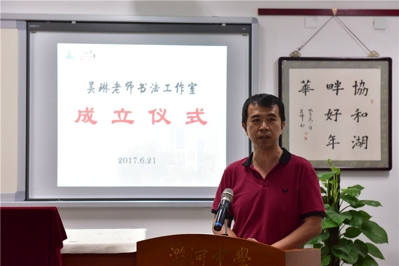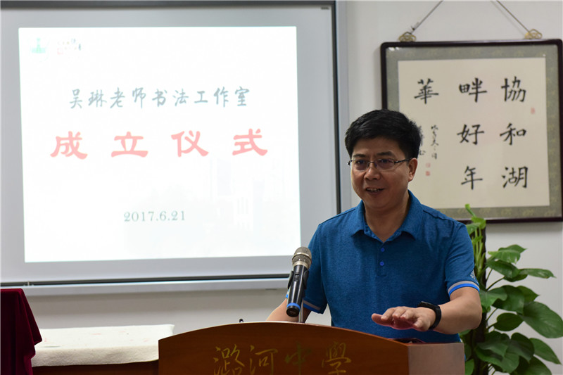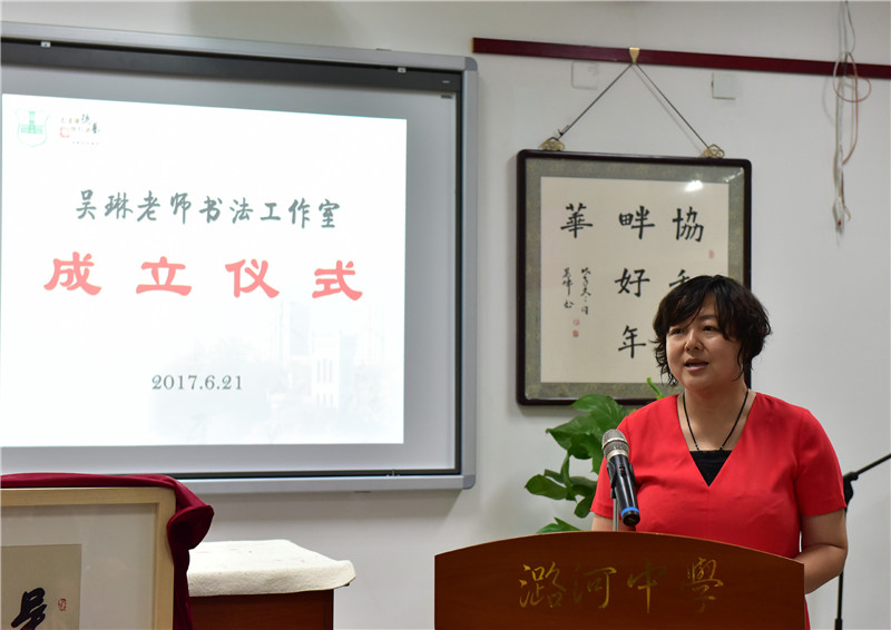工作室正式成立,吴琳老师发言,感谢领导专家恩师的帮助,感谢学生的一路陪伴,表示一定会秉承北师大、市区书协、潞河的教育理念和艺术精神,将工作室的教育功能、辐射作用、引领任务最大化发挥。为书法教育的发展尽己之责。