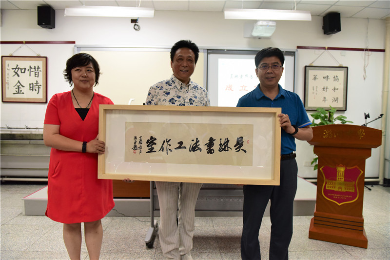 接下来,袁静华主任、田伯平主席和徐华校长共同为“吴琳老师书法工作室”揭匾,牌匾由田主席亲自题写,并宣布工作室正式成立。