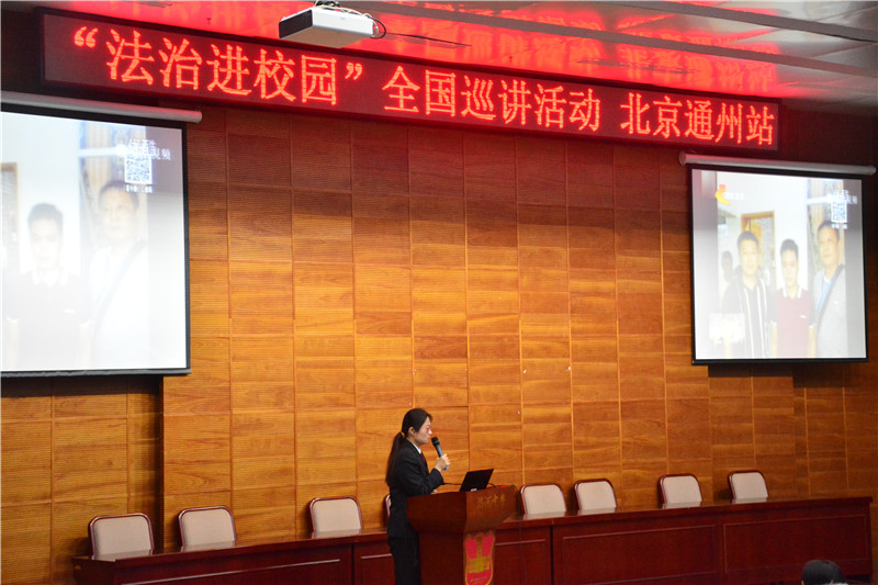 座谈会后,来自上海市闵行区人民检察院的吴翎翎检察官和来自山东省成武县人民检察院的黄辉检察官分别为我校高一、初中两个年级的800余位师生和通州区的部分法治干部进行了题为“莫让“网”事不堪回首”和“花季雨季”的讲座,讲座中,巡讲团成员深入浅出的讲解,以及一个个真实的教育案例深刻的感染了同学们。同学们不仅学习了法律知识还学会了自我保护的常识。巡讲活动最后,两位检察官分别谈到,希望同学们要知法、用法,了解自己的权利,增强用法律保护自己的能力,希望同学们要学法、守法,明白自己的义务,拒绝参与违法犯罪活动,更希望同学们真正认识到法治对于每个人的重要意义,从小养成法治意识,成为法治的忠实崇尚者、自觉遵守者、坚定捍卫者。”此外师生们还观看了通州区人民检察院根据真实案例改编的微电影。整场报告对学生们产生了深刻的触动,同学们不时用热烈的掌声表达对检察官的感谢。