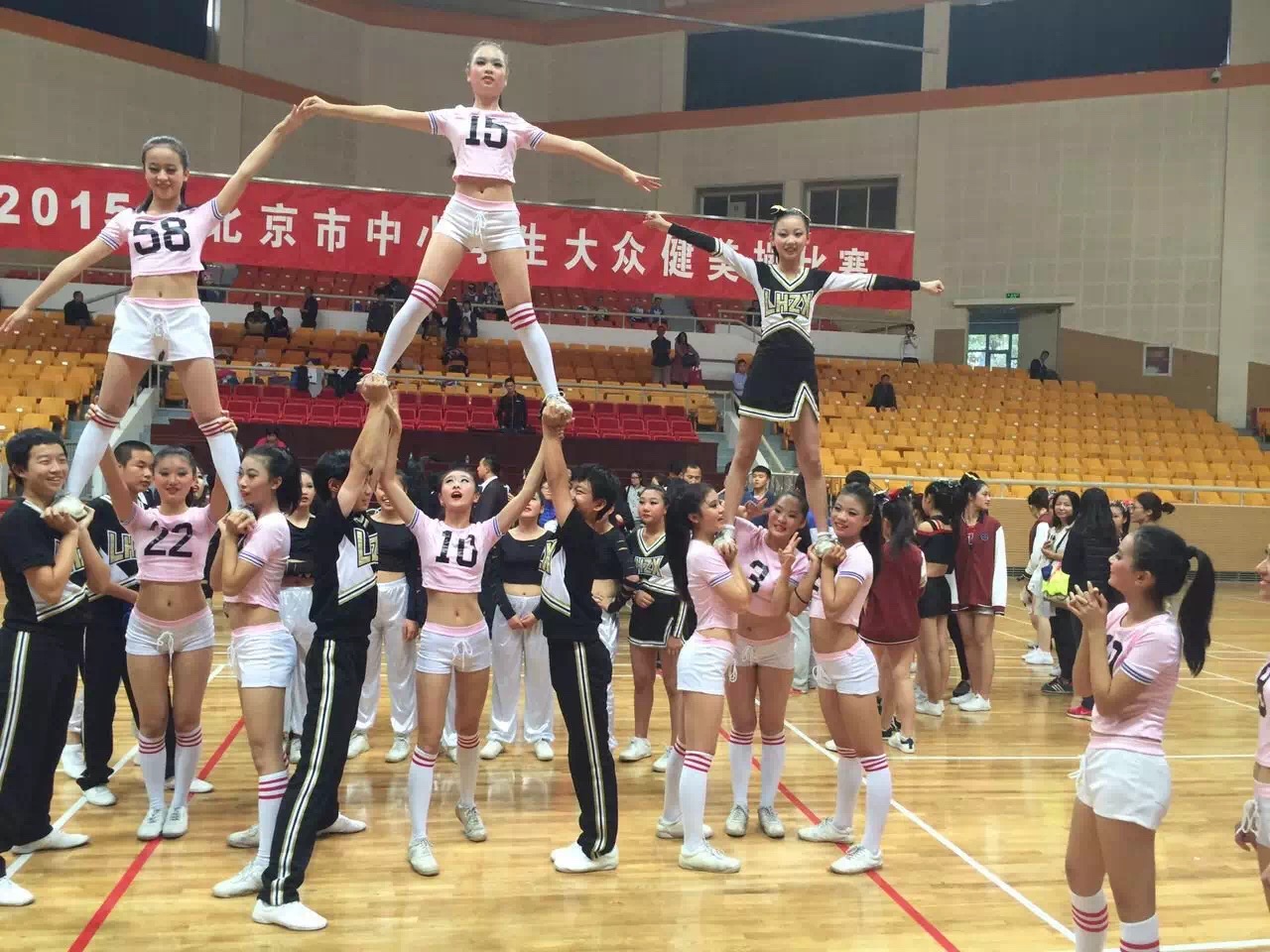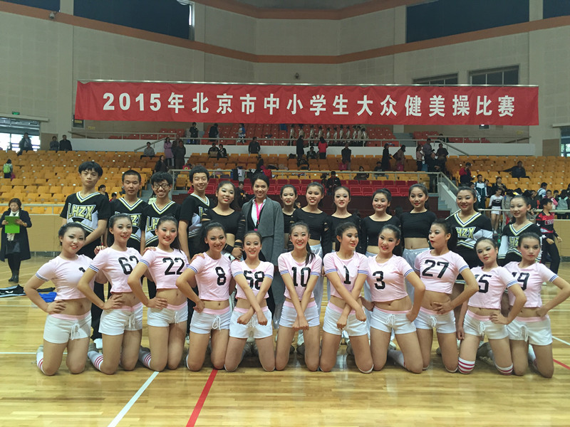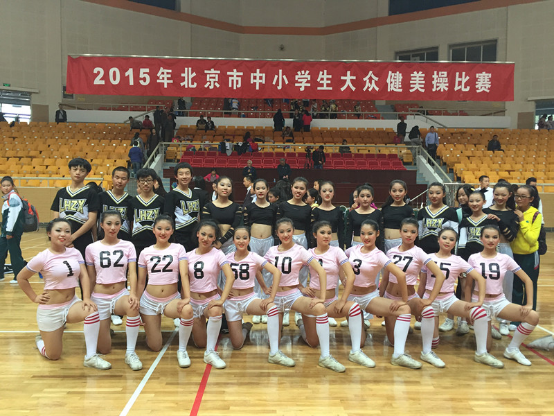 2015年北京市中小学生大众健美操比赛,于10月24日在地坛体育馆举行,我校初中健美操队在吕哲和王倩老师的带领下,有45名学生参赛,经过激烈的角逐,出色的表现,最终获得三个一等奖、三个二等奖、及初中组啦啦操团体总分第一名的好成绩!