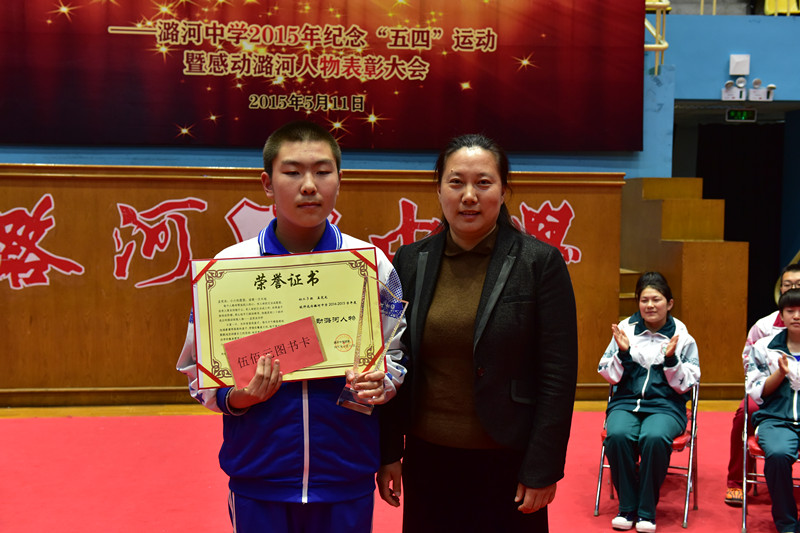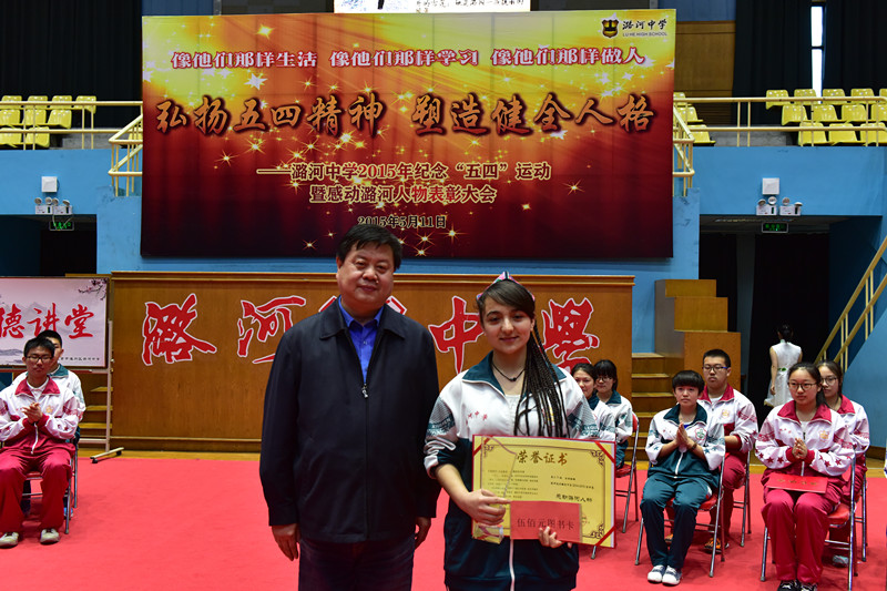 接着,大会进入高潮部分——揭晓“感动潞河人物”获得者,学生们翘首期待他们出场。他们分别是:初二3班坚持每天中午帮助四食堂收盘子的孟宪龙,他用平凡的事迹书写出了不平凡的感动,因他而发起的文明餐桌行动正在潞园如火如荼的进行着;用爱心成就梦想 用公益点燃希望的爱心公益社,多年来,他们竭力组织各类公益活动,在潞园内外传递正能量;不计付出,不辞辛苦,为同学义务服务、默默奉献四年的洗衣房志愿者团队;用灵动的文字谱写着青春乐章,编辑出版《潞园》季刊、年刊的潞园文学社;高三11班有责任、有担当、肯付出、求上进,用自己的热情感染着身边所有人,在同学中有广泛的影响力和号召力的原学生会主席古丽给娜。每个感动潞河人物的表彰都从主持简要介绍导入让同学们了解其事迹、视频短片展示使大家进一步感受其精神、内心受到触动与激励,之后由班主任或指导老师宣读颁奖词,最后由校长助理李晨松老师、孟洪峰副书记、郭连弟副校长、祁京生副校长、张洪志副校长分别为他们颁发证书、奖杯、奖品。这些真实的来自同学身边的感动,让大家心潮起伏,敬佩之感油然而生,一次次热烈的掌声在会场响起。我们能感受到这些看似平凡的事迹,却带给同学们心灵的震撼。