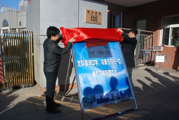 2014年12月24日,阳光明媚,天空湛蓝,北京市通州区潞河中学与内蒙古通辽市翁牛特旗乌丹一中协作学校揭牌仪式在我校东门正式举行。潞河中学校长徐华,常务副校长张洪志,党总支副书记孟洪峰与乌丹一中副校长于海涛等一行10人一起参加了揭牌仪式。仪式由潞河中学党总支副书记孟洪峰同志主持,他首先向参加仪式的领导、老师,以及潞河中学的近100名学生介绍了潞河中学与乌丹一中的合作情况,随后请徐华校长与于海涛副校长共同揭牌,随着两位校长揭开合作项目的铜牌,也标志着潞河中学与乌丹一中的合作正式开启。随后潞河中学将与乌丹一中在学校管理、教师成长、学生交流等多方面展开合作。