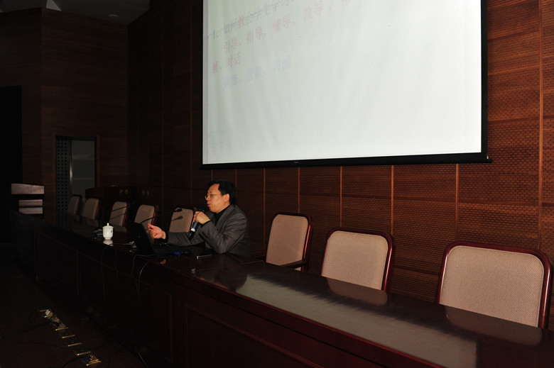 朱教授由理论引出,从几个方面分析了教师的专业发展问题。他指出,作为教师首先要了解学生,了解学生的学习与整体发展规律,才能教会学生学习。他把教学生分解成几个问题,即“如何教学生”、“教学生如何学习”和“教学生学什么”。朱教授在讲座中走到教师中间来,与大家互动,语言轻松幽默。他还指出教师育人要做到整体性,不能只关注学习成绩。最后他指出,教师专业发展往往会面临两难窘境,一方面“课上的漂亮”,另一方面不能做出学理解释;一方面其教学具有规律可循,另一方面无法清晰描述自己的教学特色。教师的专业发展离不开提高实践、反思、科研的能力。