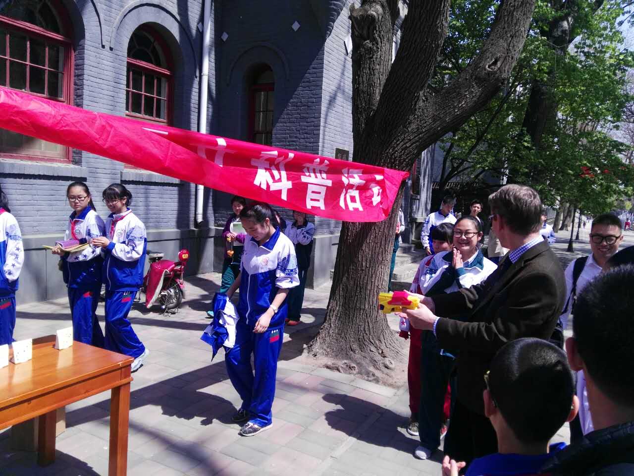 随后,威尔逊先生参观了潞河中学校史馆、图书馆及体育场,并在学校享用工作午餐。午餐后,威尔逊先生加入到潞河学子自发组织的天文社团科普推广活动中,并答对天文问题,赢得“中国24节气纪念卡”。