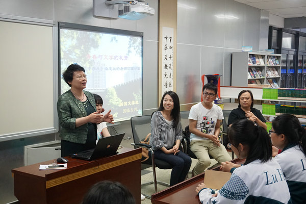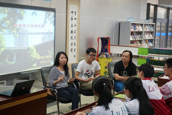 2016年5月10日下午第八节课,《中学生》杂志社副主编刘艳红、编辑王奔、编剧赵阳一行三人,与潞园文学社社员欢聚在我校图书馆一楼阅览室,畅叙“生活与创作”。本次座谈会由张丽君老师主持。我校团委副书记徐甲老师、文学社指导教师吴艳君老师、韩丽老师参加了本次活动。为了让更多的文学爱好者获益,吴艳君老师特地跑到高二楼,请文学社外热爱创作的金明顺同学一起来参加与编辑老师们的交流。恰来我校文学社采访的通州电视台也在活动现场进行了拍摄。
