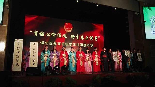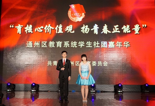 4月24日,共青团通州区教育委员会在通州教师研修中心礼堂隆重举办了主题为“育核心价值观 扬青春正能量”的通州区教育系统社团嘉年华活动。我校高一年级李梓豪、李莹莹同学担任活动主持。在现场播放的《我们的多彩社团》宣传片中展示了我校潞河之星电视台、机器人科技制作社、纸艺社、民乐团等多个社团丰富多彩的活动纪实。活动中,我校吟诵社、民乐团、书法篆刻小组、美术社学生代表展示了由邵坤、谢丹、吴琳、周东岭四位老师悉心指导,团委整合训练,融合吟诵、民乐、书法、绘画为一体的传统文化节目《春之歌吟》,使现场观众品味了浓浓的古典韵味和传统文化艺术之美。此外,我校模拟联合国社团社长杨帆同学受邀接受现场采访,畅谈模联故事以及她在潞河健全人格教育中的体验与成长。她说:“今年已经149岁的潞河是很多人梦开始的地方,她给我们的不仅是书本知识,更是主动发展追求卓越的精神引领和健全人格教育的文化的滋养。”同时,她也为由潞河模联主办、运河、永乐店中学协办的通州区第一届模拟联合国大会作了宣传,动员各高中校同学积极报名参加此项活动,在历练中展示自我,提升国际视野和思维,丰富人生领悟和体验。在活动最后的表彰中,我校天文社被评选为通州区教育系统五星级社团。