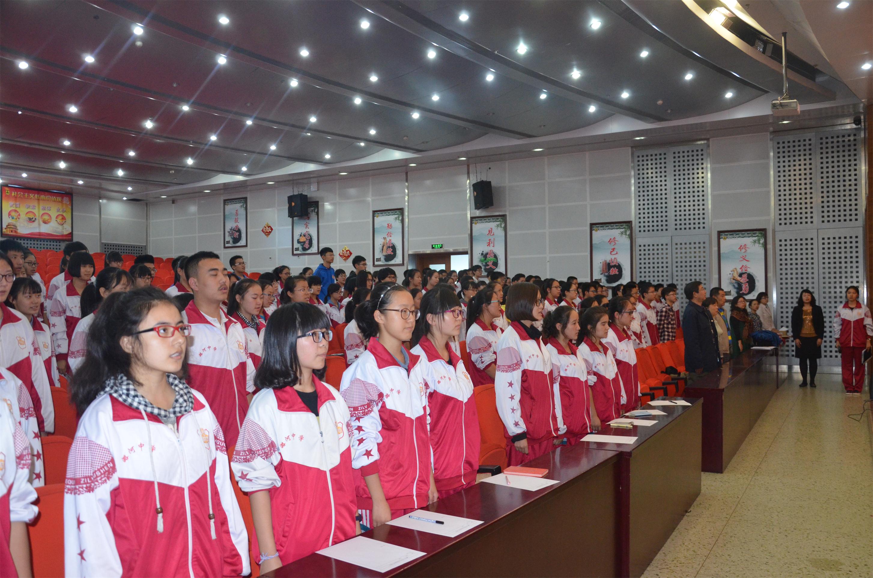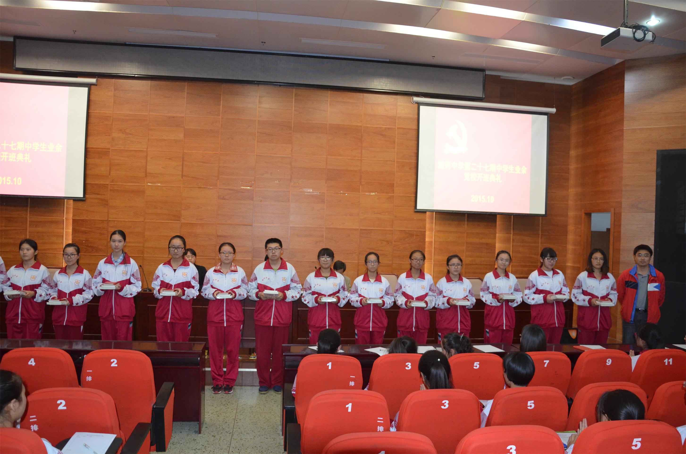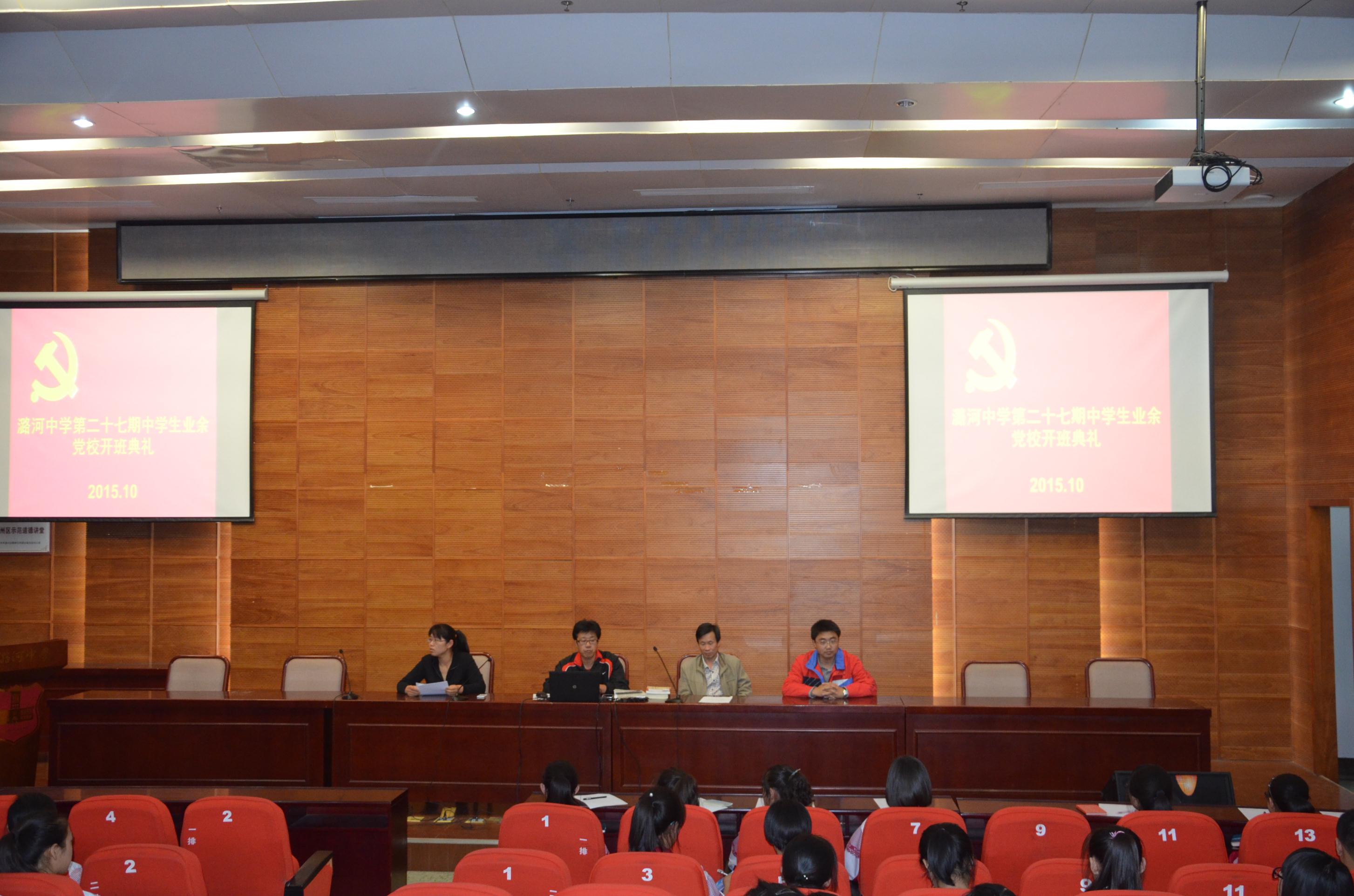 10月12日下午在我校第一报告厅隆重举行了潞河中学第二十七期中学生业余党校开班典礼。我校党总支副书记孟洪峰老师、副校长谢宏春老师、团委书记刘晓蕾老师、学生处主任李通书老师、团委副书记徐甲老师、高二年级主任郭子亮、周本军老师及高二年级业余党校指导老师叶青、陈阳等11位老师出席了会议。在开班典礼上,党总支副书记孟洪峰老师向辅导员颁发聘书,谢宏春副校长为我校业余党校学员代表授旗,李通书主任为学员代表颁发学习书籍。最后,本期业余党校186名学员聆听了孟洪峰书记讲授的第一堂党课。孟书记通过多种方式生动地展现了中国共产党的诞生及夺取革命胜利的曲折道路,希望同学们保持对党的追求。学员们认真聆听、做笔记,很多同学在听课心得中表示自己对党的了解更深一层,坚定了向党靠拢的信念,明确了自身发展方向。