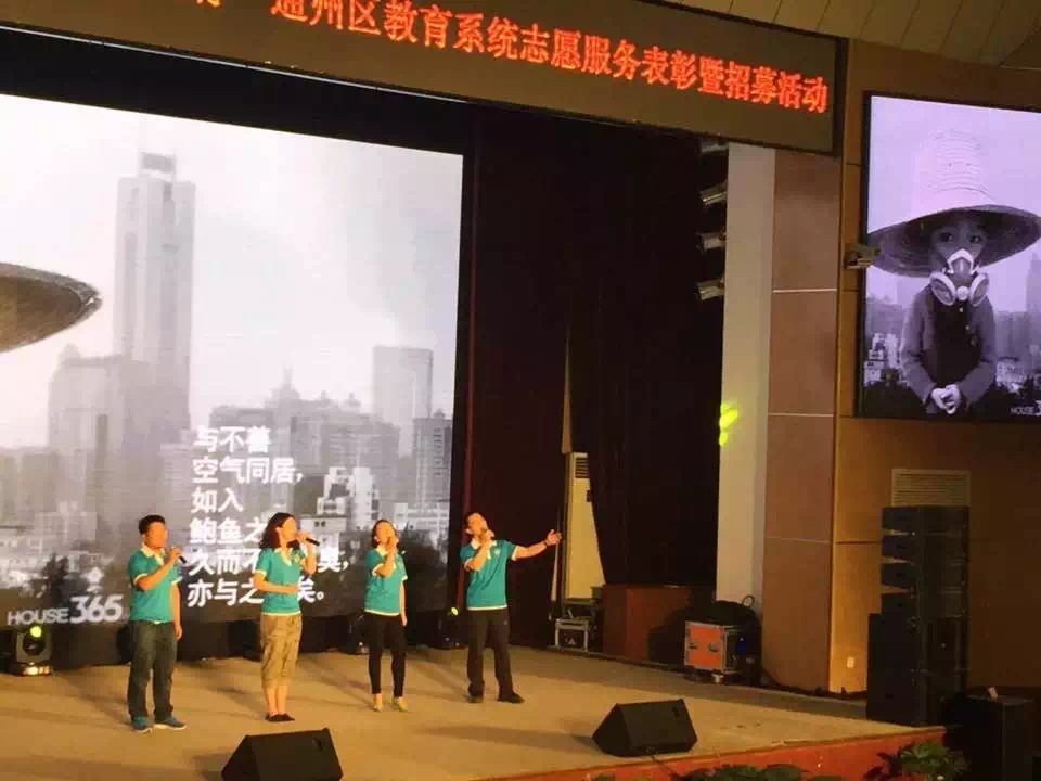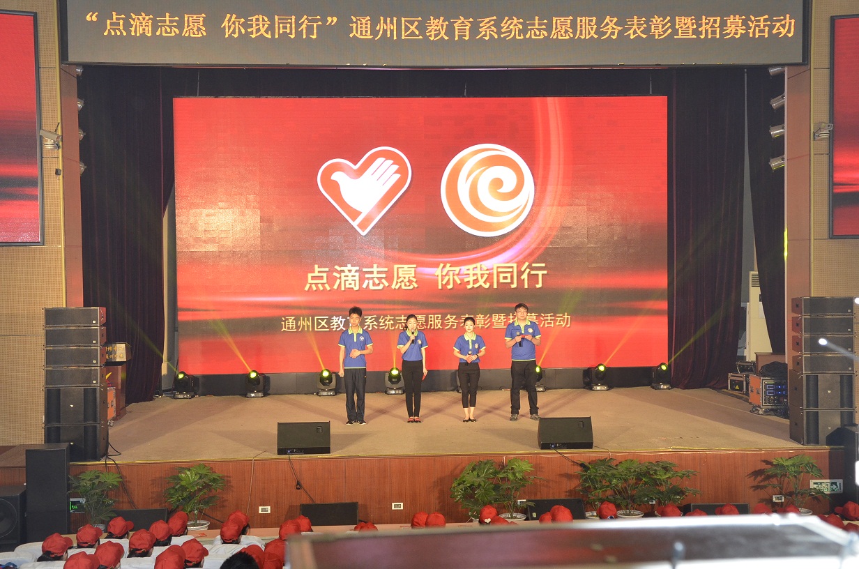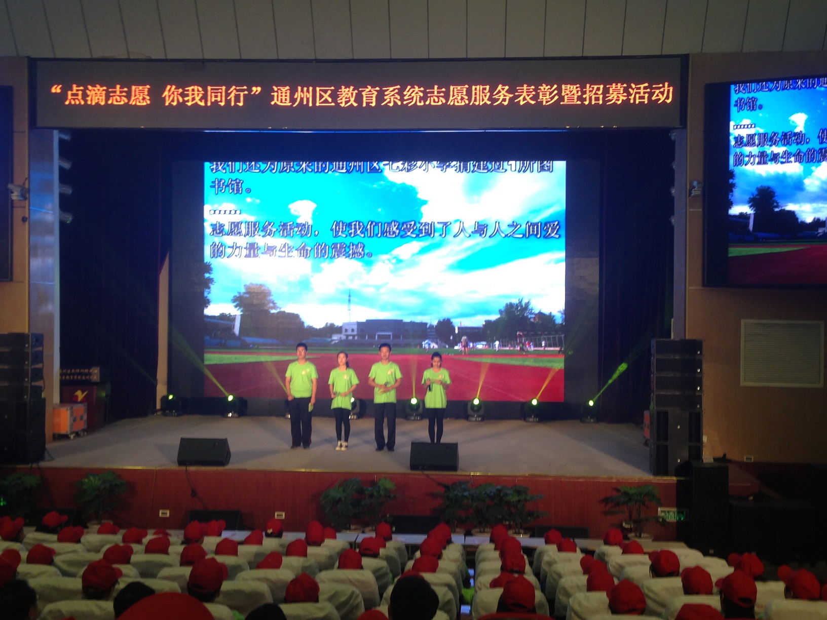 4月26日,在研修中心召开通州区教育系统“点滴志愿 你我同行”志愿服务表彰暨招募大会,团市委中少部副部长薛健同志、 区文明办主任张卫东同志、区委教工委书记、教委主任张绍武同志等领导及各校志愿服务负责人、学生代表出席大会。会上我校马嘉骏、黄晓杰、衡文轩、阿丽米热四名同学代表我校做主题为“用我们的双手捧起世界的爱”志愿服务活动榜样示范演讲。四位同学通过大量照片,两段精彩视频,从学生角度讲述我校志愿服务品牌活动以及参与活动的感受和收获。他们的精彩讲述受到领导、老师们的好评,会后我校马嘉骏同学接受通州电视台采访。李书梅老师获通州区教育系统志愿服务优秀个人称号,高一谢菲尔德志愿服务队获三星志愿服务队称号。此次大会,我校学生邵佳、李京泽参与主持,颁奖礼仪、护旗等环节均主要由我校志愿者负责,同学们认真工作,表现了良好的素质,同样受到很多老师的称赞。