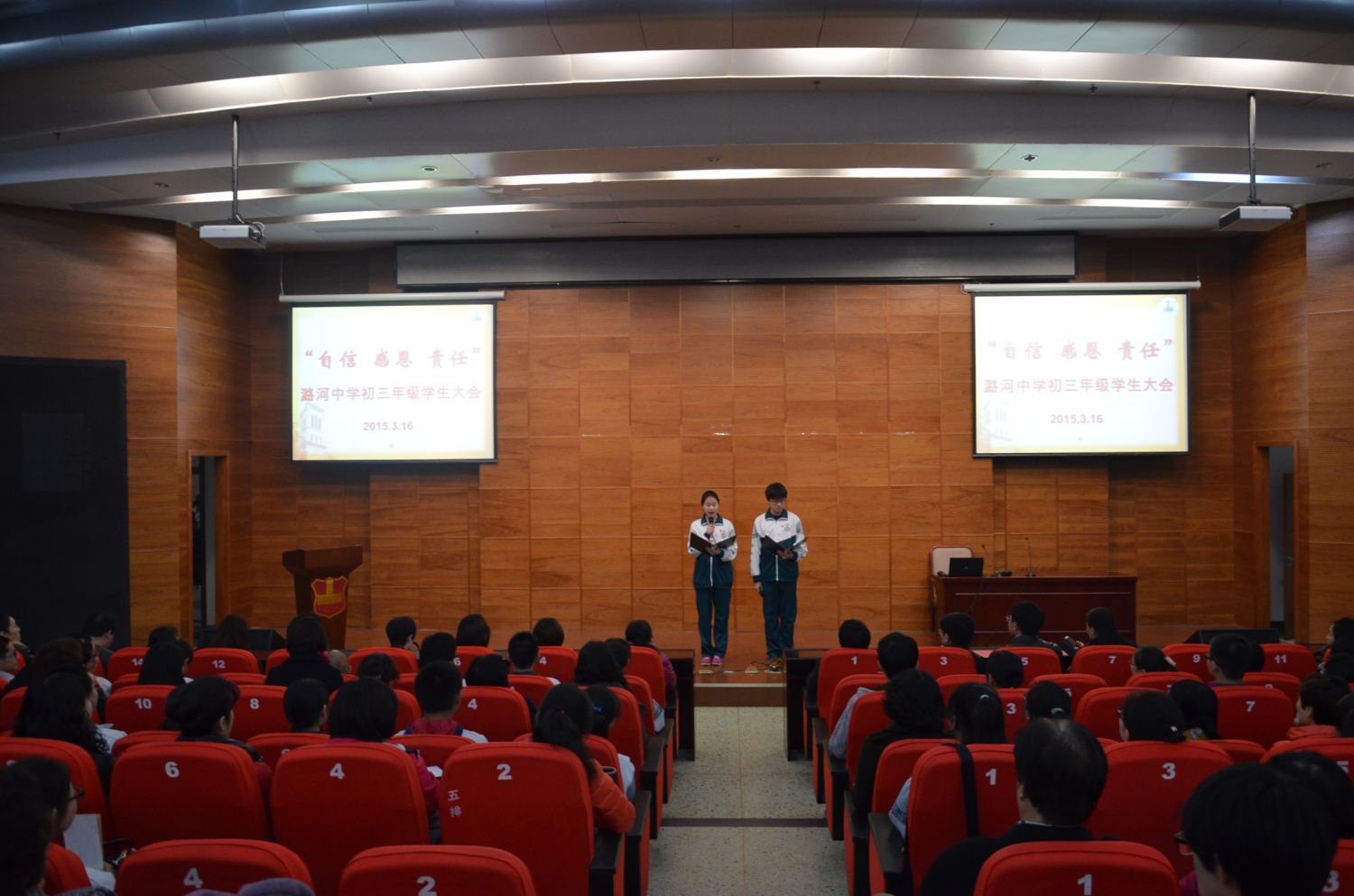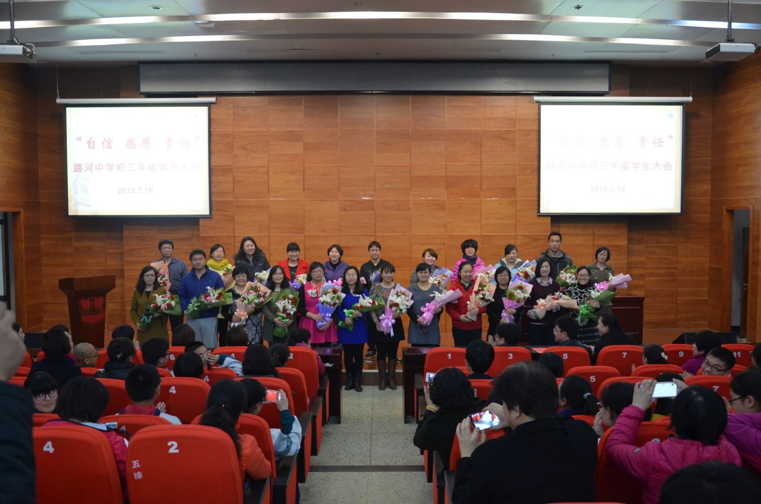 3月16日,“自信、责任、感恩”初三年级学生大会在潞河中学第一报告厅隆重召开。潞河中学初三年级全体师生与学生家长参加了此次大会。 大会第一个环节,同学们和父母交换彼此的书信和礼物,通过这种特殊的情感交流方式,加深孩子和父母之间的理解。接着,同学们向他们敬爱的老师献花,表达对老师深深的感谢与敬意。之后,举行了严肃、庄严而富有教育意义的入团宣誓仪式,由团委副书记徐甲老师带领初三年级全体152名新团员宣读誓言。随后,初三年级2个班为一组共4组学生代表发言,孩子们带领大家回忆了他们三年中在潞园学习生活的点点滴滴;他们感恩老师;他们致谢同学;他们畅想未来;他们通过振奋人心的宣誓,表达为理想与责任奋力一搏的决心!最后,初三年级主任王雷老师擂响中考战鼓给孩子们加油鼓劲,徐华校长发表讲话,希望孩子们能减轻心理压力,在中考中取得好成绩。至此,潞河中学初三年级学生大会落下帷幕。