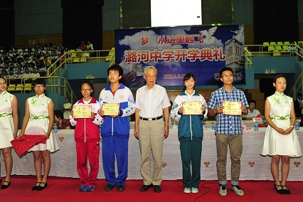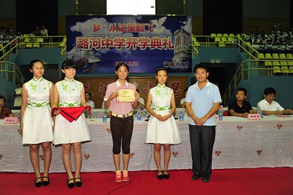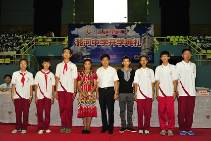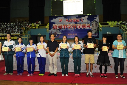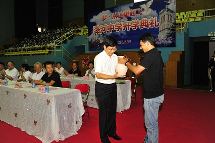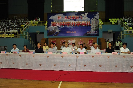 灿烂金秋,梦,从这里起飞!——潞河中学2014—2015学年度开学典礼于8月31日,在潞友体育馆隆重举行。通州区人民政府区长,潞河中学名誉校长岳鹏、通州区人民代表大会常务委员会主任张文山、中共北京市通州区委副书记李玉君、通州区政府办公室主任王岩石、通州区教工委副书记胡晓东、潞河中学校友会名誉会长,潞河中学1948届校友,北京航空航天大学教授,陈昌祐校长之子陈大光、潞河中学校友会副会长,潞河中学1962届校友,原通州区关心下一代协会会长罗敬义、潞河中学1967届校友,原北京工业大学机电学院党委副书记党朝红、韩美林工作室代表,韩美林艺术馆副馆长任德永共同出席典礼,与我校的师生一同迎接新学年的到来。