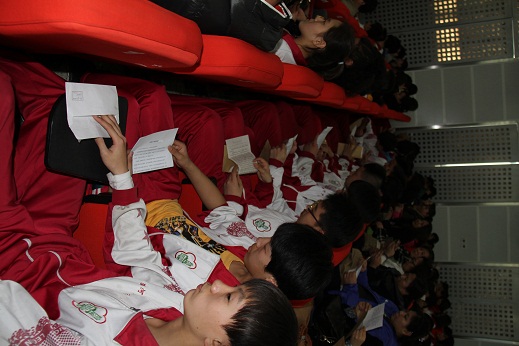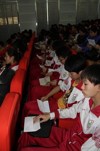 初三年级各班同学纷纷进行振奋人心的宣誓,表示在中考前的日子里将不懈奋战,以实现梦想!最后,同学们向他们敬爱的老师献花,表达对老师深深得感谢与敬意。在庄严的国歌声中,潞河中学2013—2014初三年级学生大会落下帷幕。